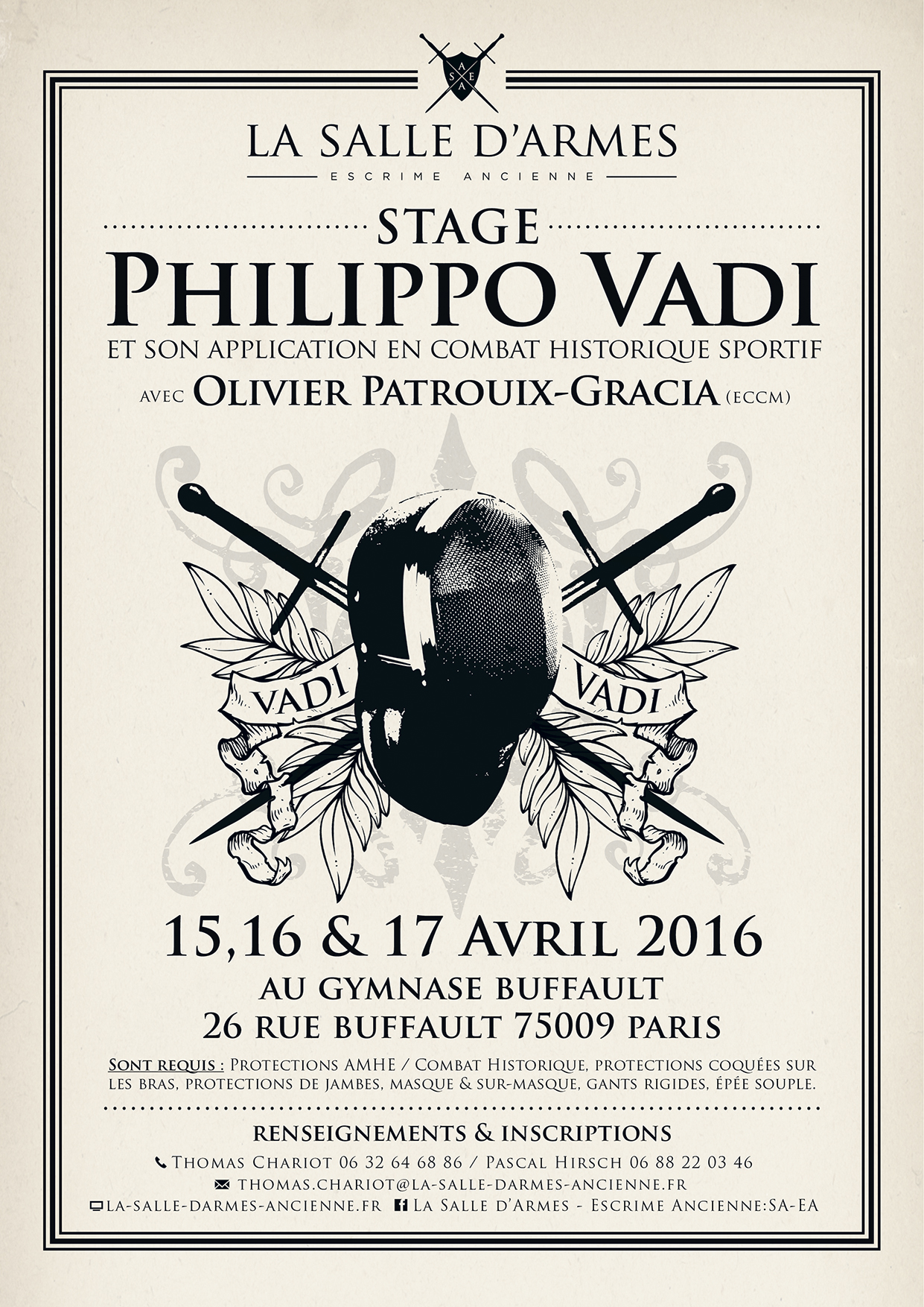 Vous trouverez ci-dessous l'affiche du stage de Combat Historique organisé à la "Salle d'Escrime Ancienne" à Paris (Tour d'Auvergne) du 15 au 17 avril.